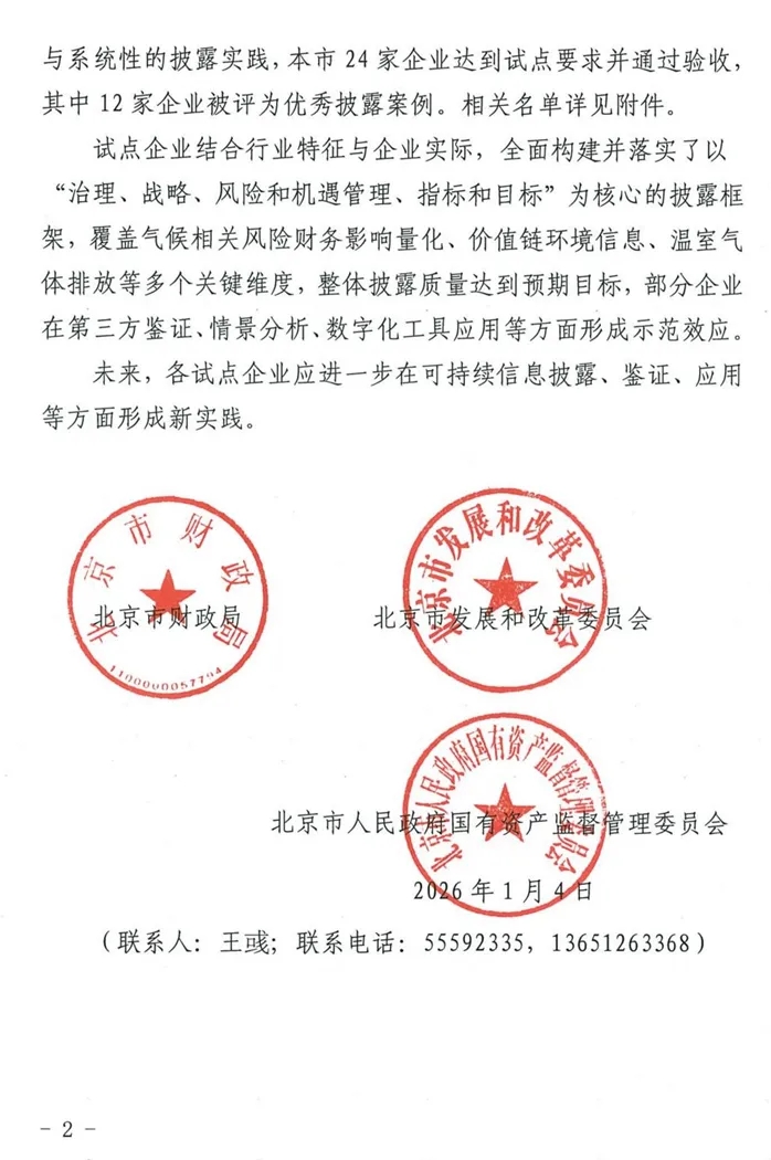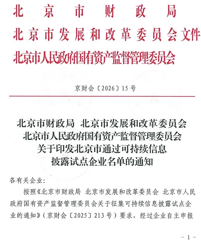 2026年1月4日,北京市财政局、北京市发展和改革委员会、北京市人民政府国有资产监督管理委员会联合下发了《关于印发北京市通过可持续信息披露试点企业名单的通知》,投资北京凭借扎实的自主申报与系统的披露实践,成功入选试点企业名单。此举标志着公司在贯彻国家可持续发展战略、推动信息披露标准化与多元化方面取得重要突破。